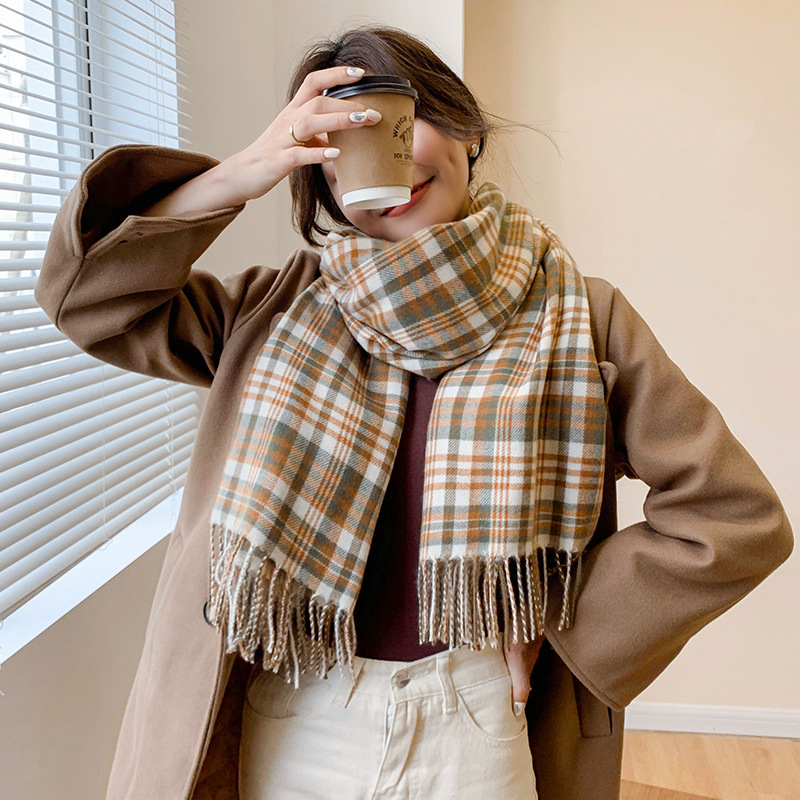 格子围巾女冬季2021新款韩版仿羊绒格子线条流苏披肩防寒保暖围脖
