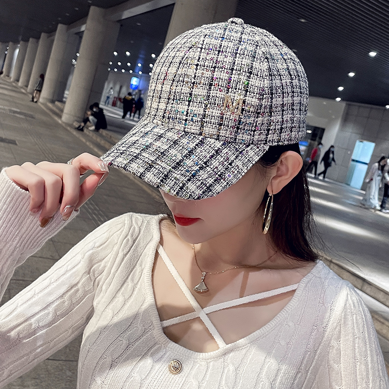 韩版潮百搭帽子女春秋天时尚格纹亮片棒球帽显脸小m标休闲鸭舌帽
