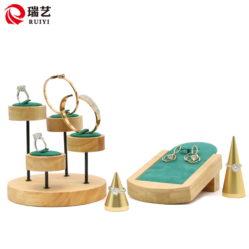 饰品展示架 绿色竹木超纤绒布4位戒指架竹木耳环架原木珠宝首饰架