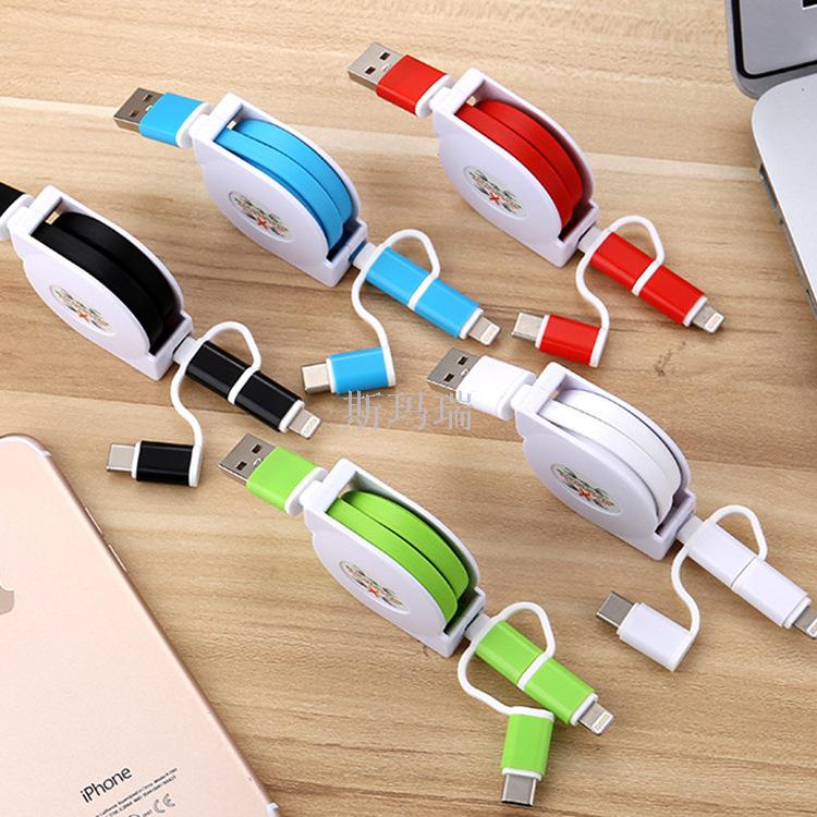 伸缩数据线 三合一圆形 TYPE-C安卓苹果充电线 一拖三快