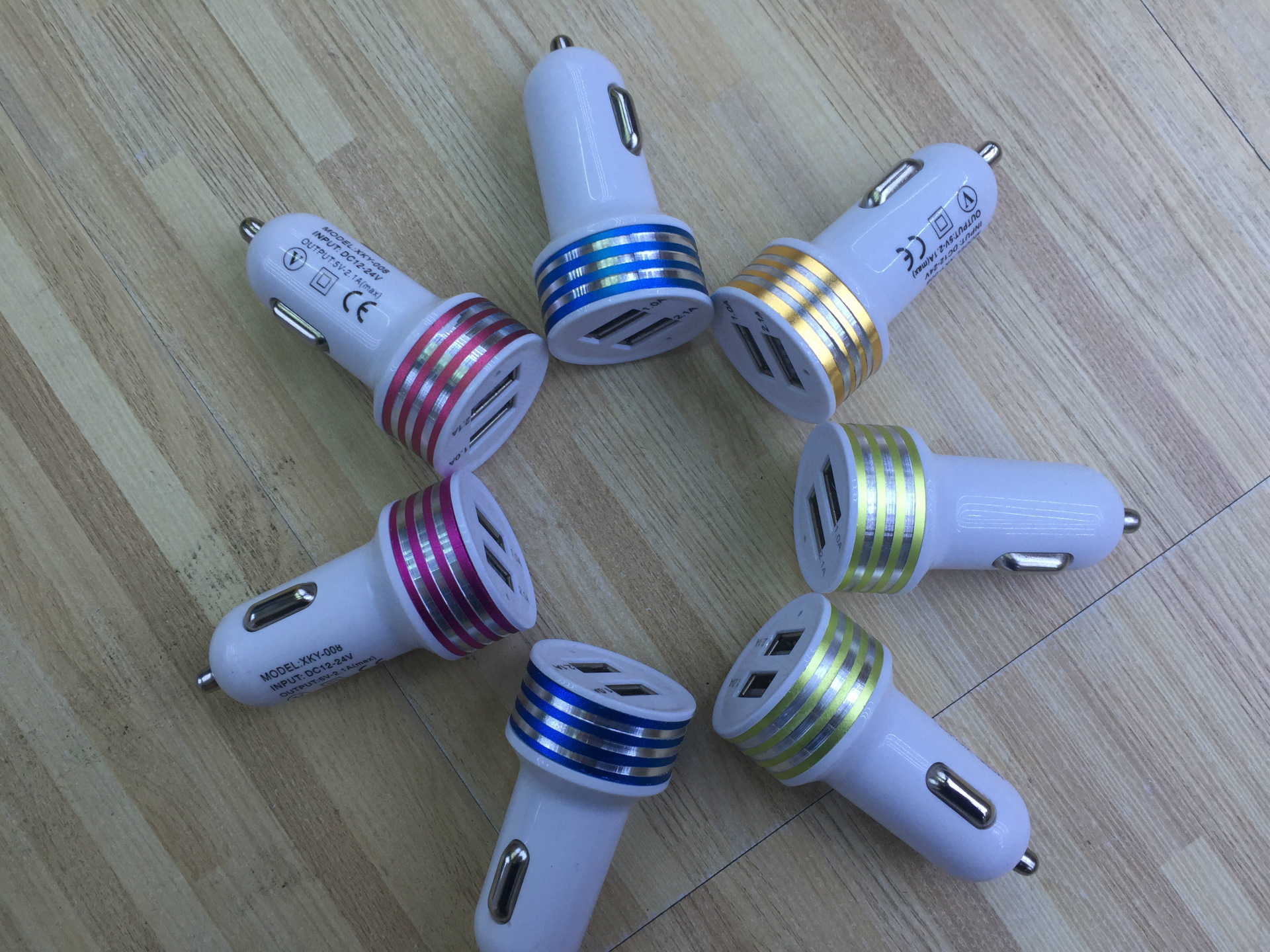 双USB车载充电器 2.1A 铝合金光环奶嘴圆形车充金属彩边