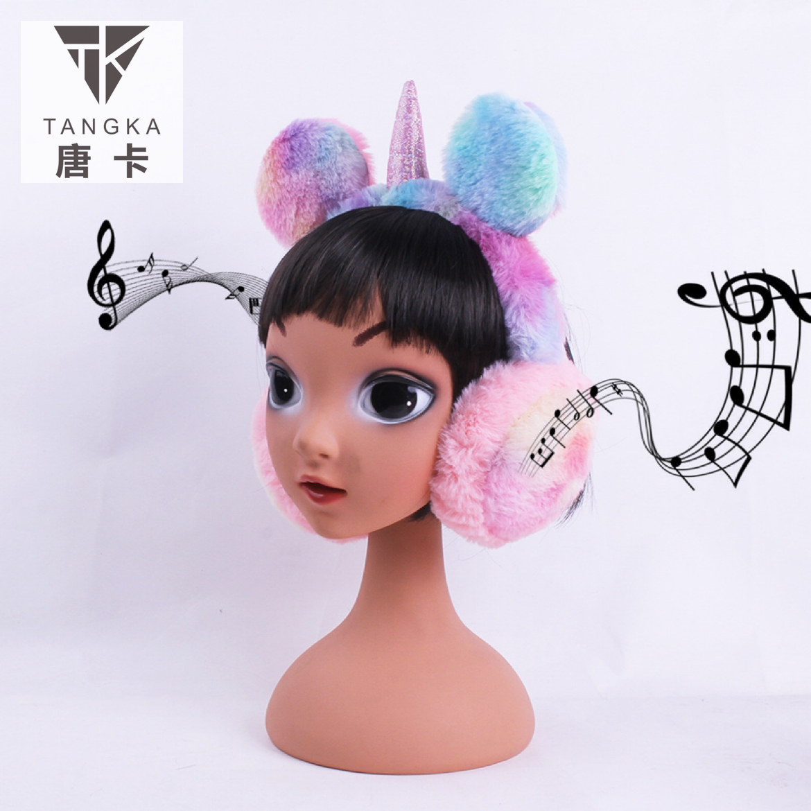 新款彩色毛绒保暖头戴式耳机独角兽可爱耳朵有线耳机卡通耳机跨境