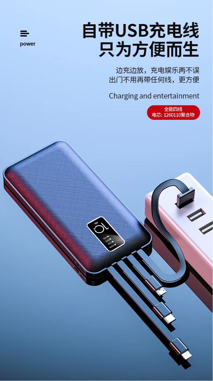 批发创意自带线20000毫安充电宝礼品定制 轻薄移动电源PowerBank