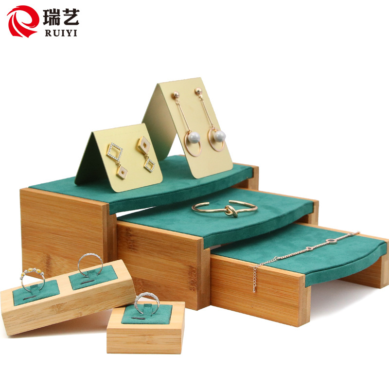 珠宝展示架 绿色竹木超纤首饰架流水台三件套戒指架耳环架手链架