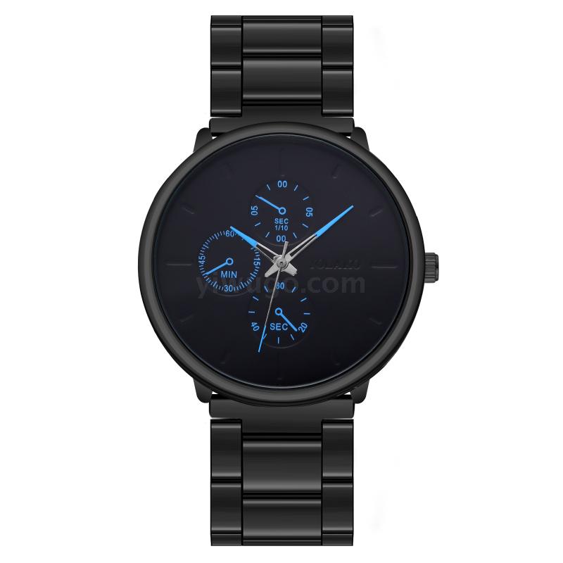 外贸爆款三眼欧美时尚蓝针男士手表男表钢带折叠扣石英表厂家批发