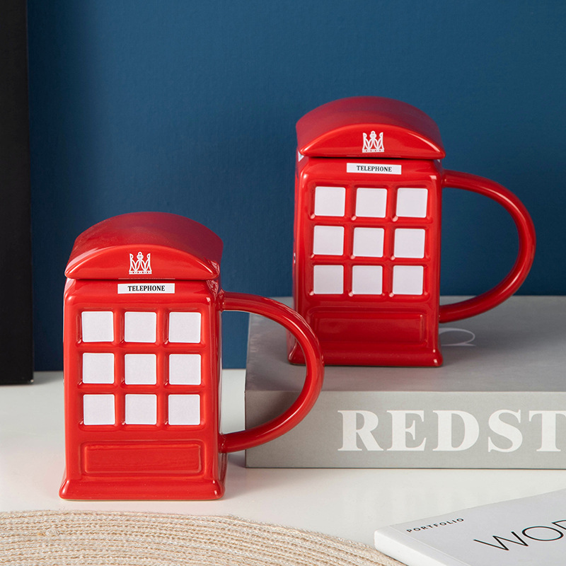 创意复古英国警亭杯子 陶瓷杯 电话亭陶瓷杯带盖新奇马克杯咖啡杯