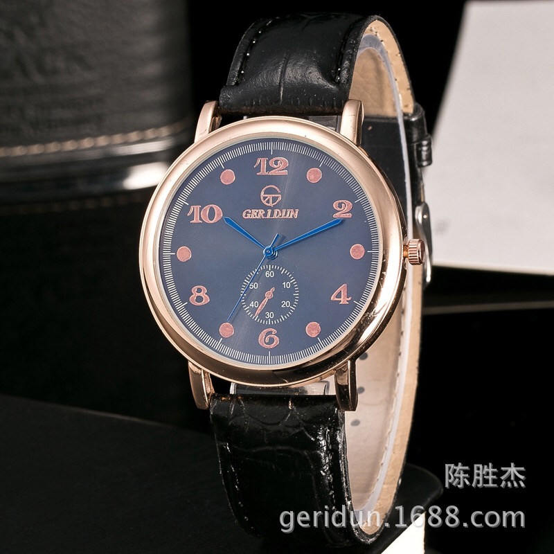玫瑰金数字面简约时尚幻蓝玻璃皮带手表男士石英腕表情侣表