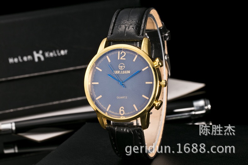 金色皮带手表情侣表幻蓝玻璃假三眼数字面男士手表