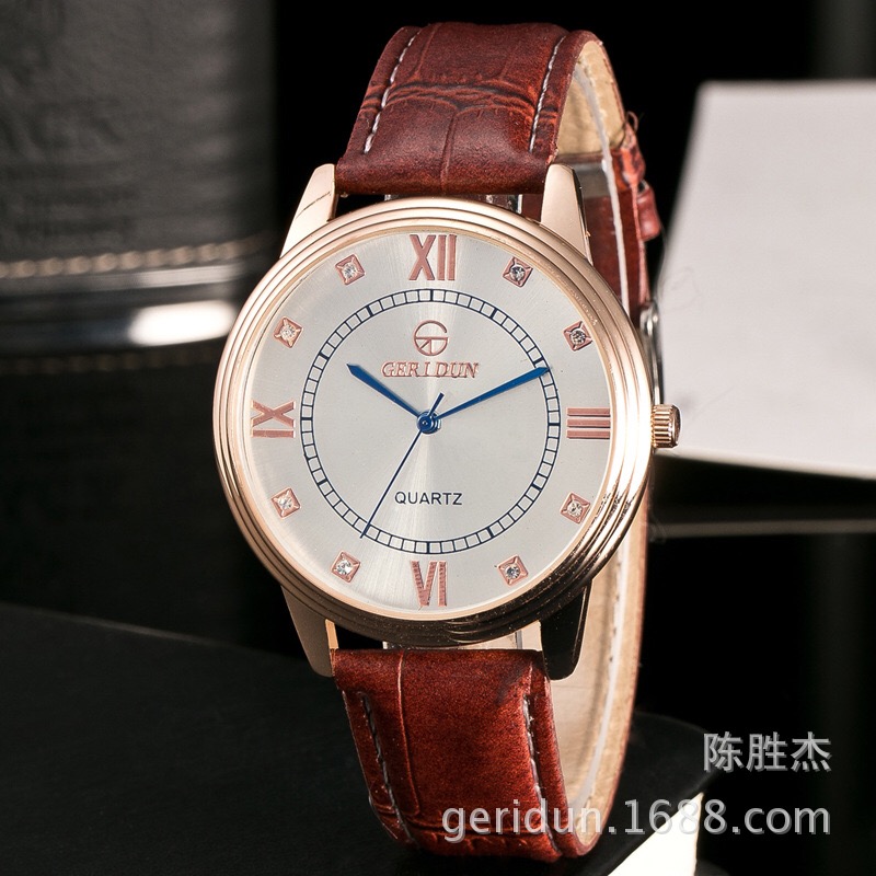 玫瑰金罗马数字刻度幻蓝玻璃皮带手表男士女士情侣表