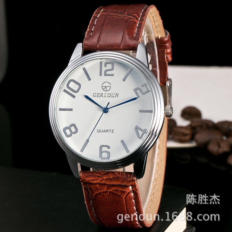 白壳数字面简约时尚皮带手表幻蓝玻璃男士手表