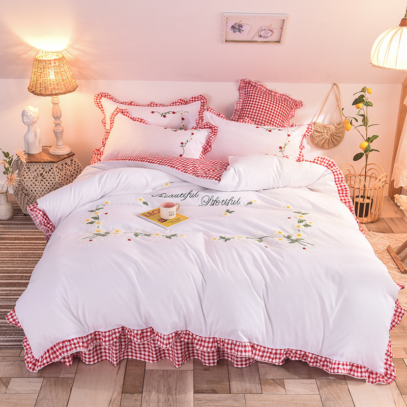 厂家直销新款ins网红风纯色韩版绣花四件套被套床单床品代发