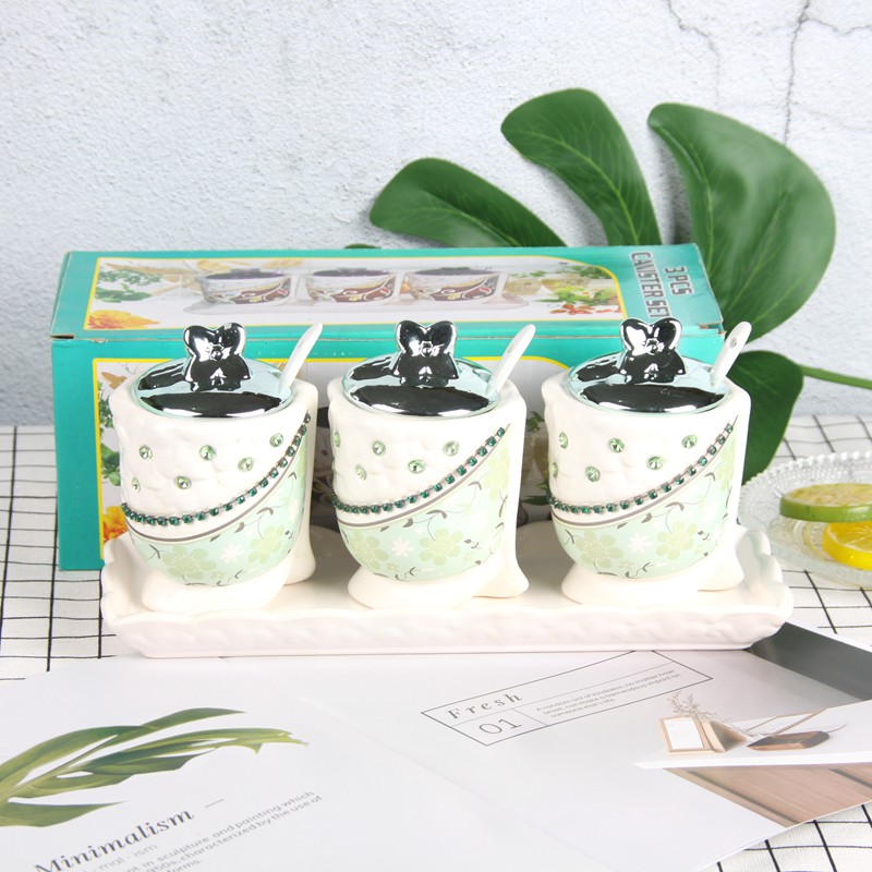 优质带彩盒陶瓷创意杯彩金电镀浅绿色三件套调味瓶调味罐调料罐