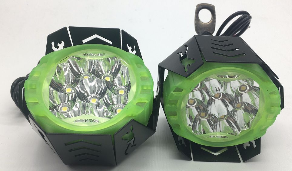 摩托车大灯圆形9灯25W黑绿色万向支架白光常亮3030灯珠12-85V3线