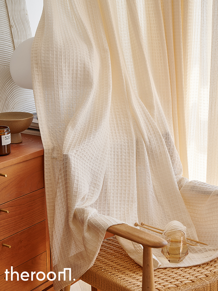 日式棉麻奶油色加厚格子纱帘透光不透人2021新款客厅阳台卧室窗帘
