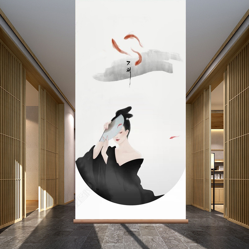现代中式卷帘遮光半透明办公室隔断人物挂式屏风装饰客厅玄关云海