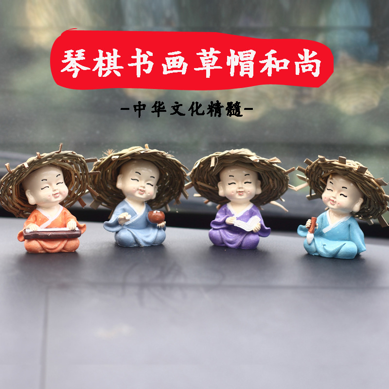 新款树脂工艺品琴棋书画草帽和尚车内装饰品创意汽车摆件保平安