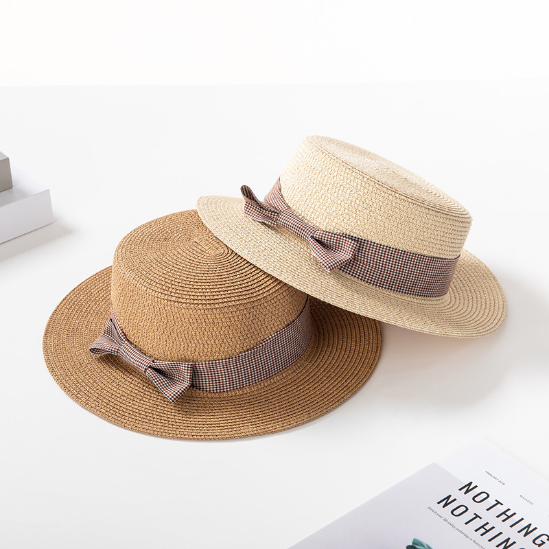 小清新平顶帽子女夏天复古防晒遮阳帽出游百搭甜美蝴蝶结沙滩草帽