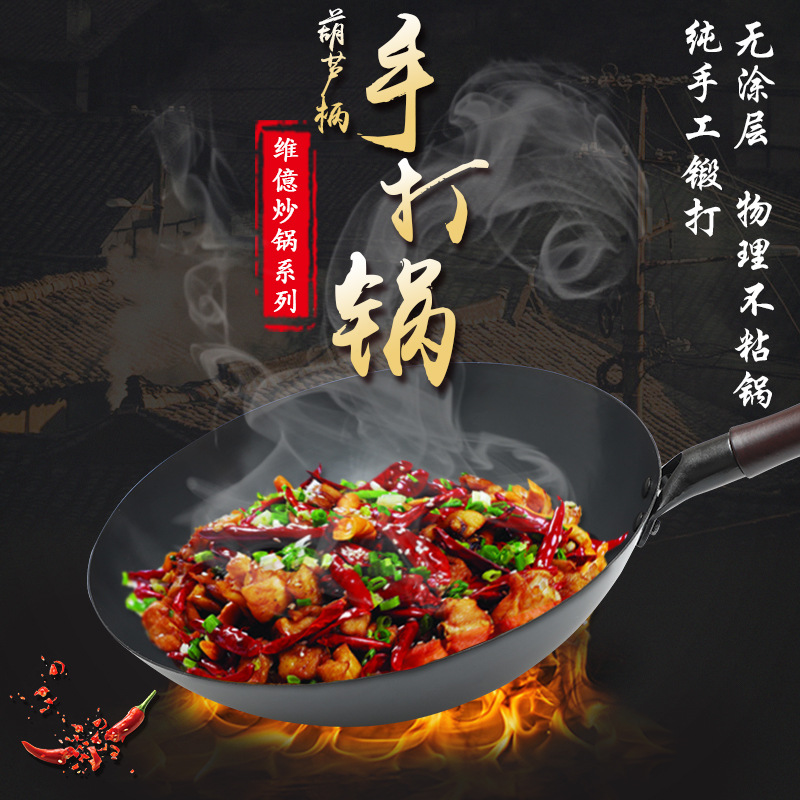 无涂层锅葫芦柄手打黑钢炒锅不粘锅铁锅家用健康炒菜锅厂家直销