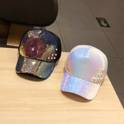 春夏季时尚个性棒球帽女户外出游珍珠亮片遮阳防晒chic百搭鸭舌帽