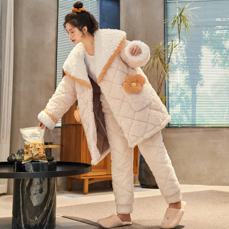 秋冬款珊瑚绒睡衣女加绒加厚三层夹棉袄冬季可爱法兰绒家居服套装