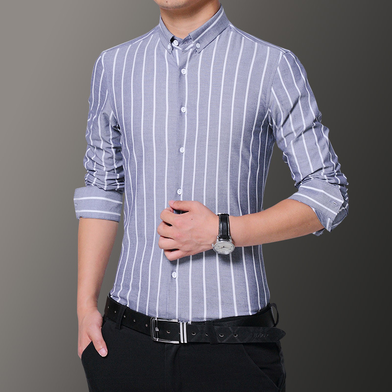 2021新款条纹长袖衬衫青年休闲男士衣服修身牛津纺衬衣轻商务男装