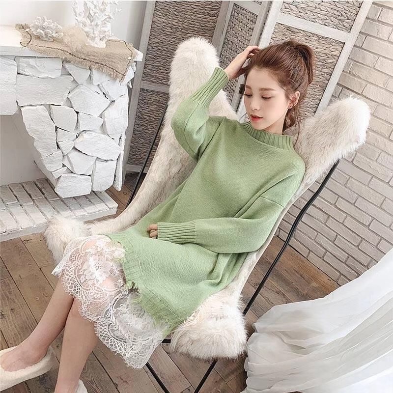 2020毛衣裙中长款秋冬新款韩版宽松女拼接中长款过膝针织连衣裙