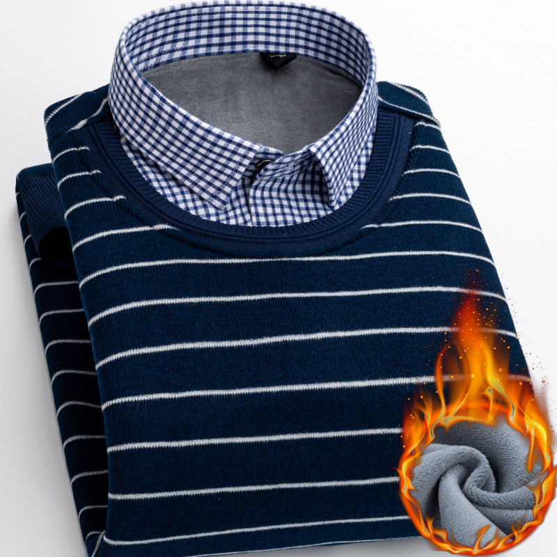 假两件保暖衬衫加绒加厚男圆领条纹加绒衬衫爸爸装中年秋冬男装宽