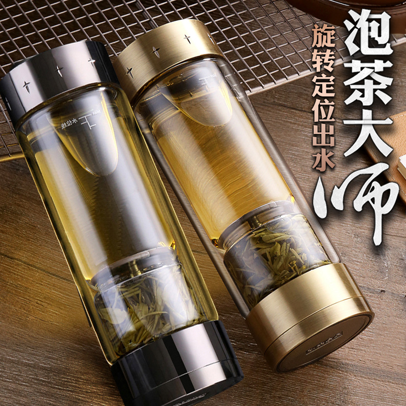商务礼品茶水分离玻璃杯子男士双层泡茶杯旋转高硼硅保温水杯定制