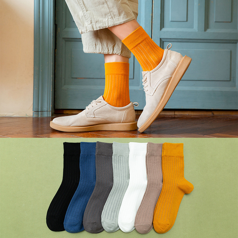秋冬新款棉袜批发男士竖条中筒袜 抽条纯色商务袜长袜子 厂家直销