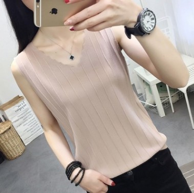 女装春夏新款冰丝背心无袖t恤打底吊带针织衫花边V领宽松上衣