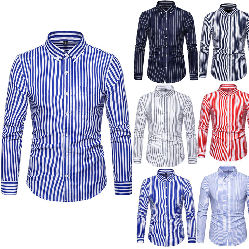 春夏薄款男士衬衫长袖衬衣男装休闲的衬衫男条纹聚酯纤维男式寸衫