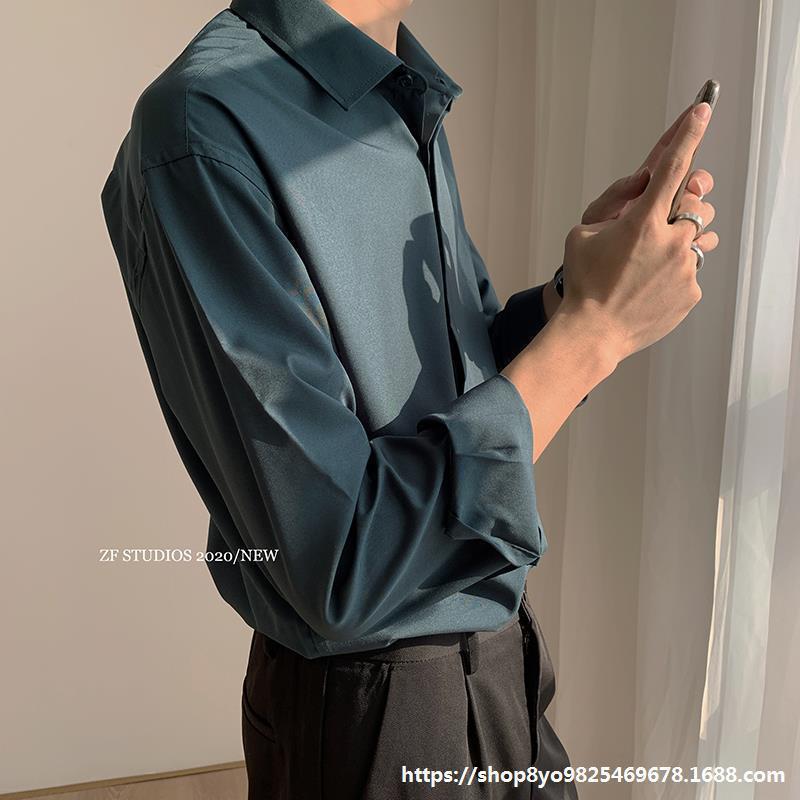 禁欲系气质复古百搭垂感免烫墨绿色白衬衫男长袖韩版宽松潮流春秋