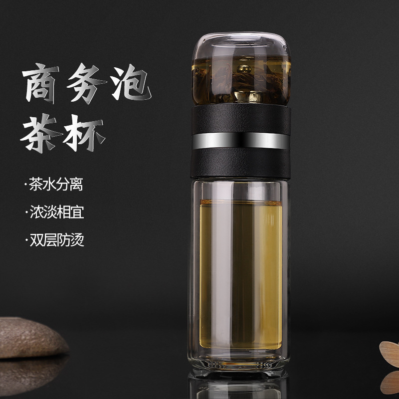 新款现货旋转式茶盖便捷式茶水分离玻璃杯商务双层泡茶玻璃水杯