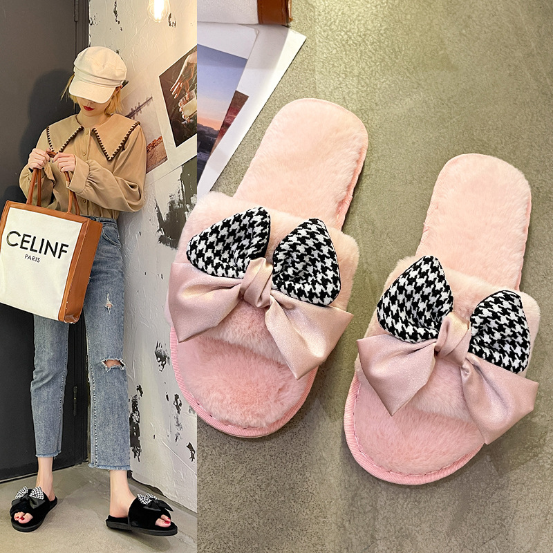 居家棉拖鞋女秋冬新款时尚室内家用防滑可爱蝴蝶结一字毛毛拖ins