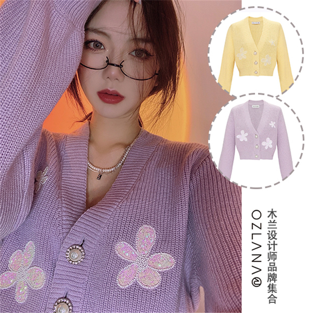 刺绣小花v领短款针织开衫女秋季2021年新款韩系宽松洋气毛衣外潮