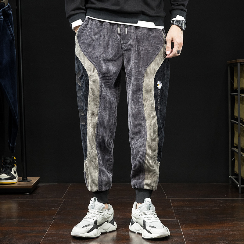 2020秋冬款男士灯芯绒哈伦休闲九分裤日系宽松哈伦两色拼接小雏菊