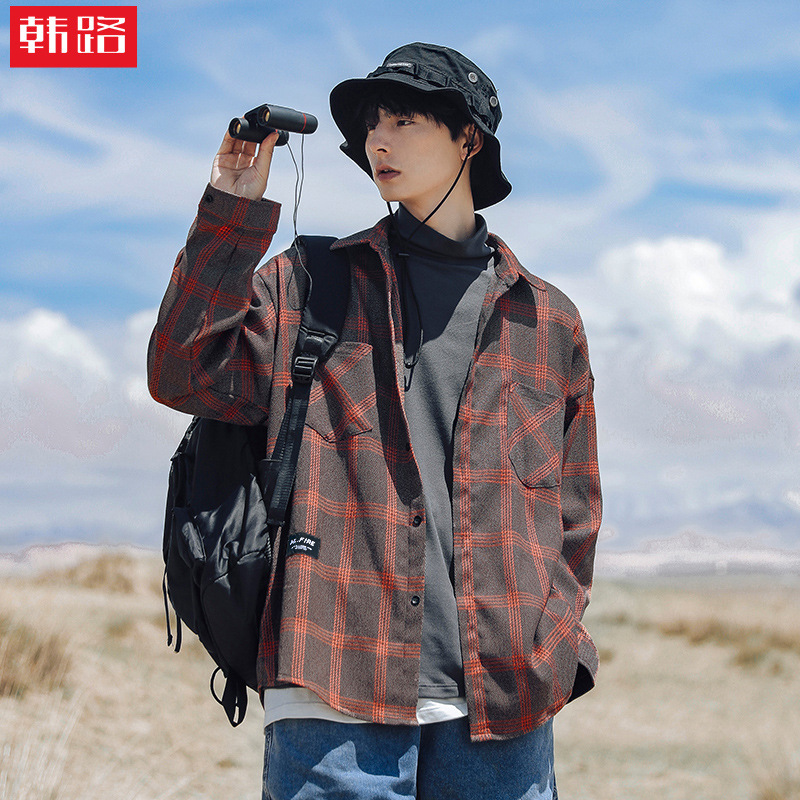男装 2021秋季新款撞色格子衬衫男贴标设计简约百搭长袖衬衣