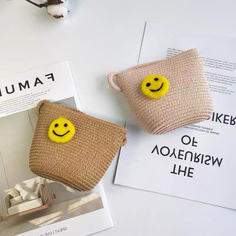 秋硕原创儿童草编斜跨包包零钱包羊毛毡笑脸配件