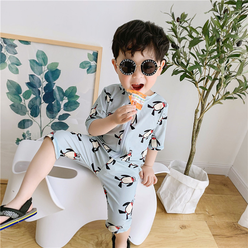 韩国韩版儿童沙滩泳衣裤男童防晒小童中童连体企鹅冲浪服套装带帽