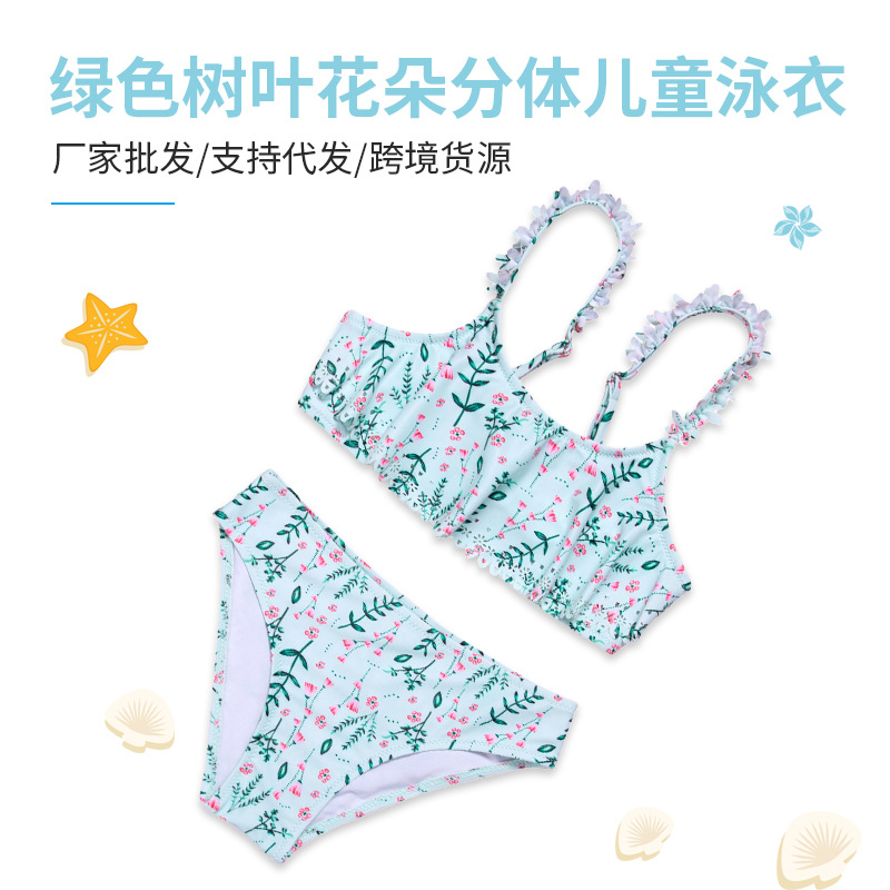 儿童分体泳衣花瓣肩带外贸2020新款绿色花朵女童游泳衣