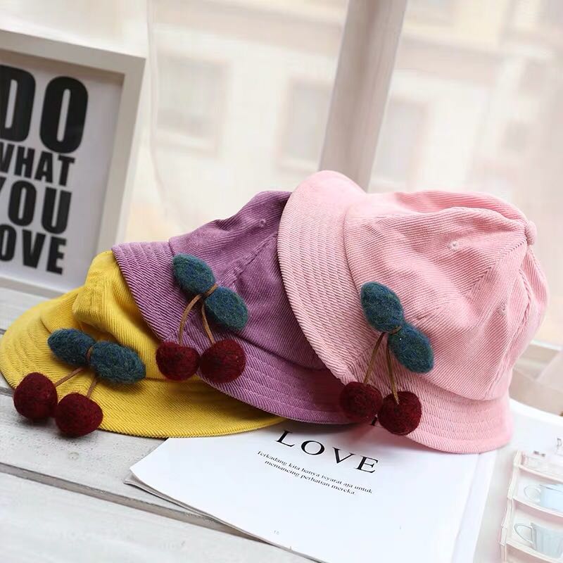 秋硕可爱樱桃渔夫帽软妹灯芯绒儿童盆帽子亲子款遮阳帽春季太阳帽