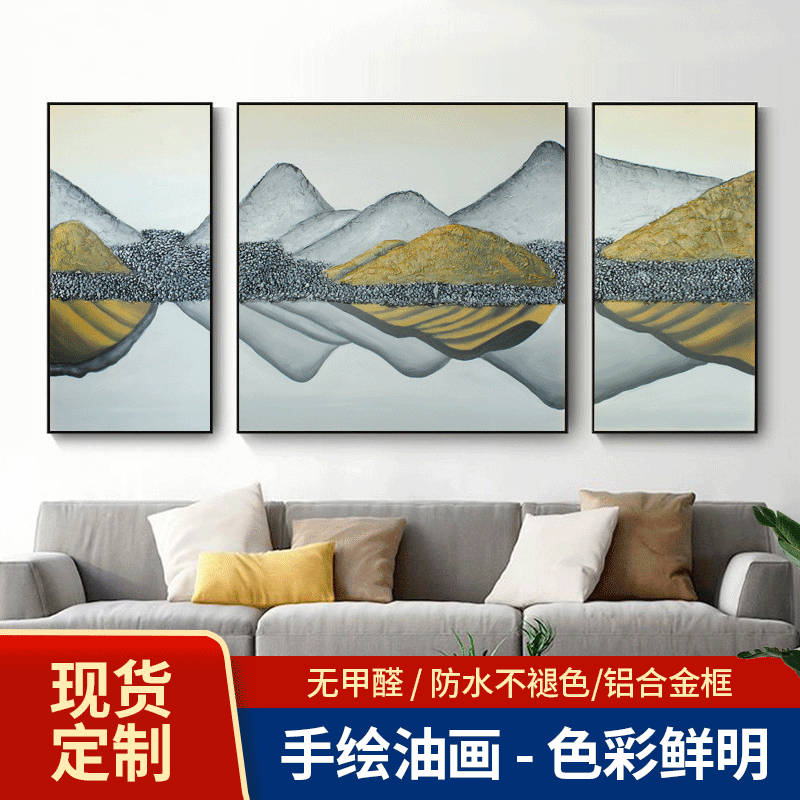 手绘油画 新中式山水装饰画客厅三联幅挂画油画实物装置画可定制