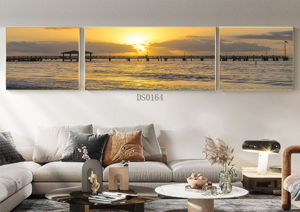 高清定制现代喷绘画装饰画酒店帆布油画壁画三联日落沙滩跨境货源