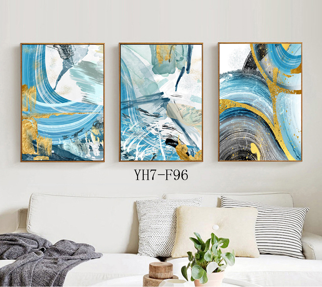 现代美式蓝色抽象挂画客厅沙发背景墙面装饰画简美轻奢大气三联画