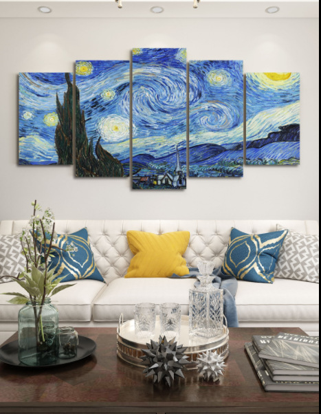 简约客厅装饰画卧室装饰壁画帆布油画打印喷绘五联拼接画星空框画