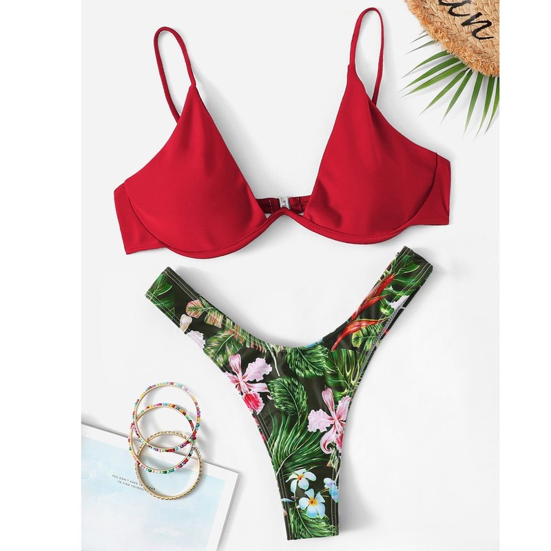泳衣性感比基尼 2020欧美刚拖聚拢型泳衣树叶印花分体泳装BIJINI
