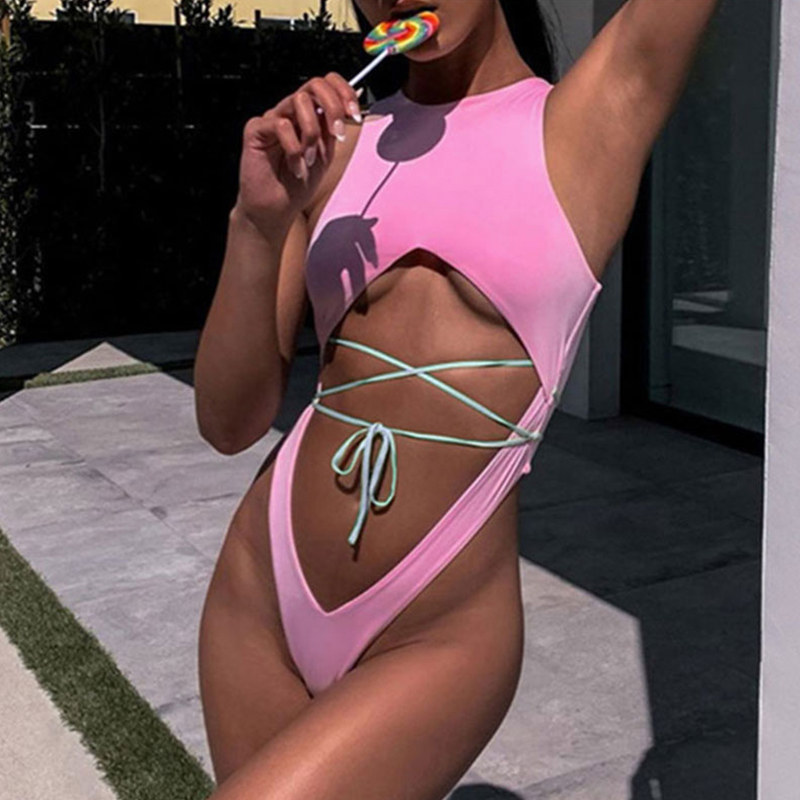 泳装性感泳衣V型裤连体泳衣纯色绑绳泳衣镂空泳装比基尼