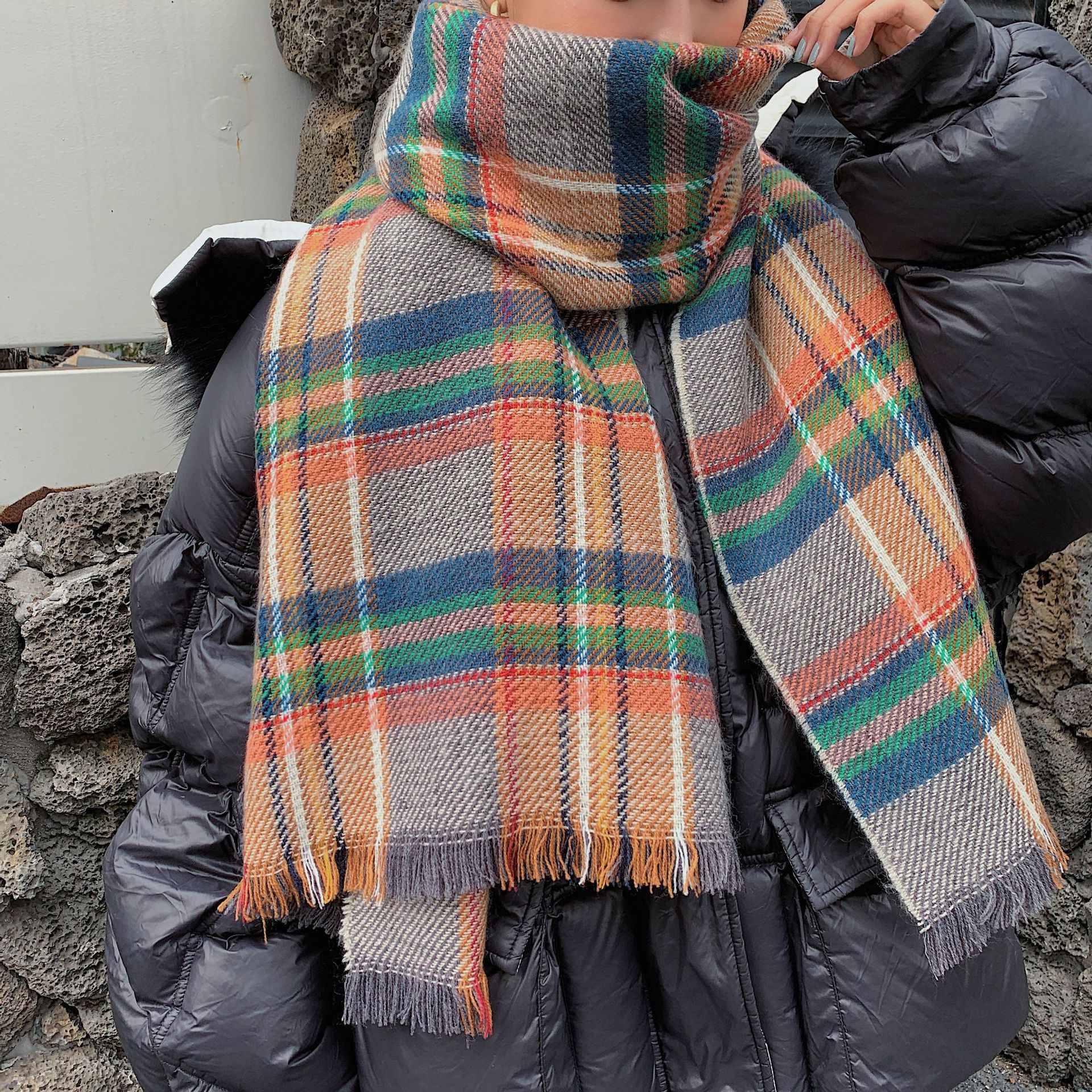 格子围巾女冬季新款ins少女韩系文艺风长款百搭拼色学生短须披肩