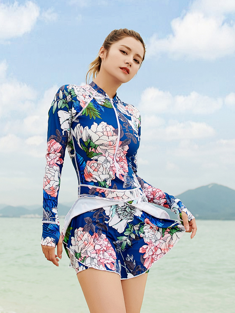 2021新款女式泳衣连体裙式防晒长袖沙滩温泉厂家直销休闲时尚