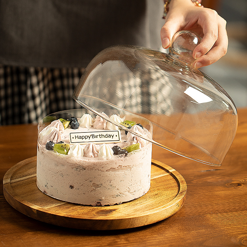 无铅透明蛋糕玻璃盖 食物罩蛋糕盘防尘展示玻璃罩带竹木旋转托盘